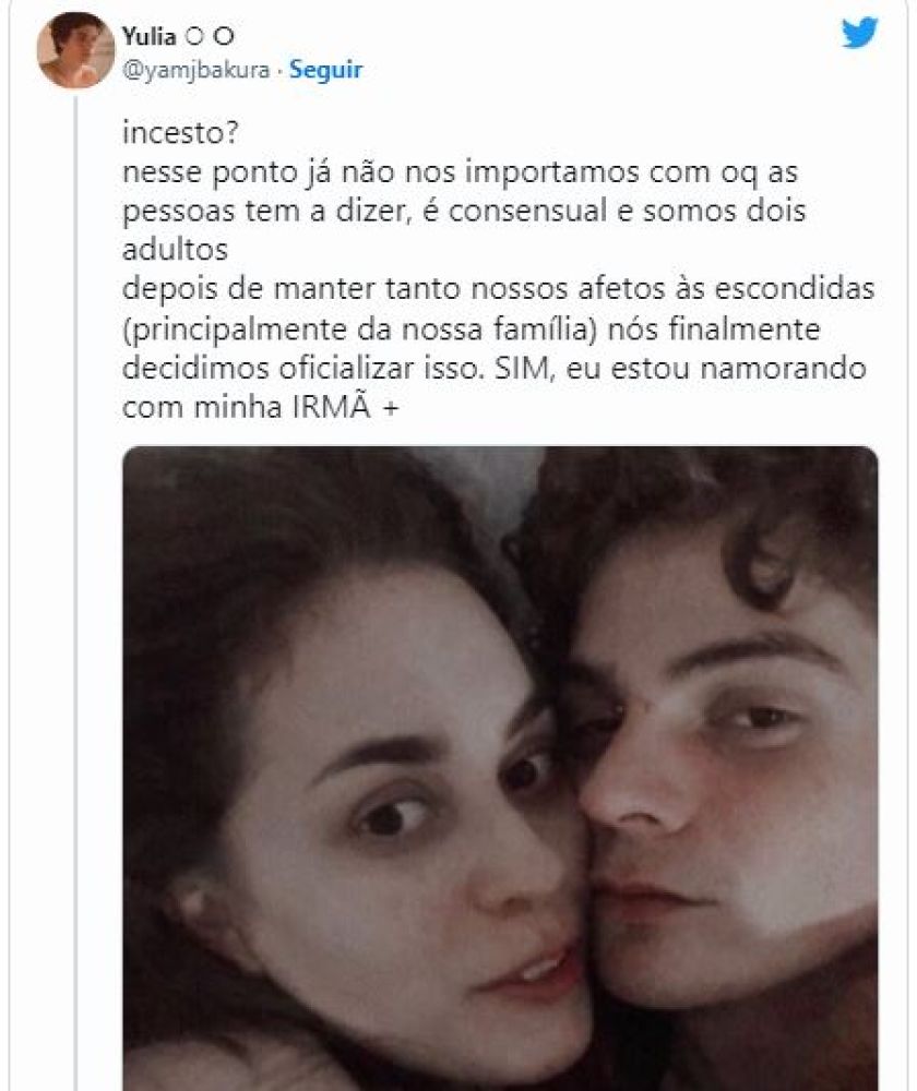 O jovem Yulia publicou no Twitter que está oficialmente namorando a sua própria irmã. O caso gerou grande repercussão no dia 30 de agosto, última terça-feira, e muitos internautas expuseram seus pontos de vista acerca do assunto, considerado incesto. De acordo com Yulia, o relacionamento entre os dois já acontecia às escondidas e foi consensual, e somente agora resolveram oficializar diante da família e a todos.